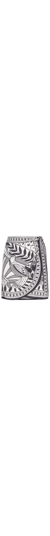 A saia preta é confeccionada em tecido leve sem elasticidade. A peça solta ao corpo, de modelo pareô, possui cintura alta, transpasse frontal, barra arredondada na parte frontal, mix de estampas em cores contrastantes, comprimento curto e fechamento lateral por amarração.
