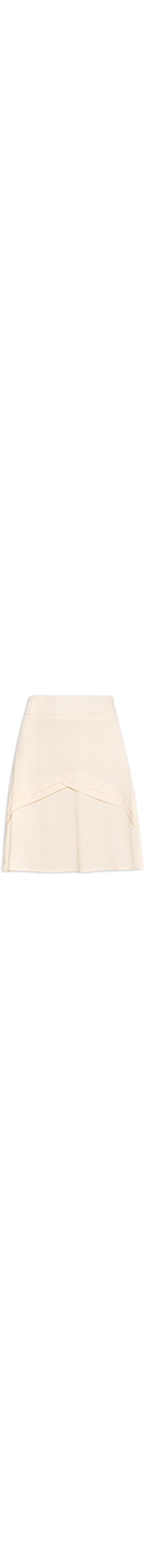 A saia bege é confeccionada em tecido leve com toque de linho sem elasticidade. A peça solta ao corpo possui cintura alta, pences posteriores, recortes sobrepostos com pregas na parte frontal e posterior, comprimento curto e fechamento lateral por zíper invisível.