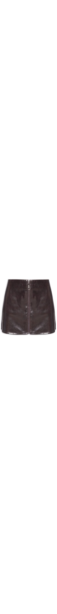 A saia marrom é confeccionada em material sintético com superfície resinada sem elasticidade. A peça justa ao corpo possui cintura alta, recortes estruturais, forro, comprimento curto e fechamento frontal por zíper aparente.