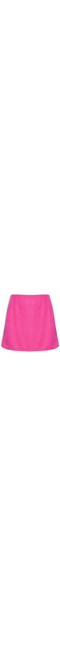 A saia rosa é confeccionada em tecido leve sem elasticidade. A peça solta ao corpo possui cintura alta, pences frontais e posteriores, barra mullet arredondada, forro comprimento curto e fechamento posterior por zíper