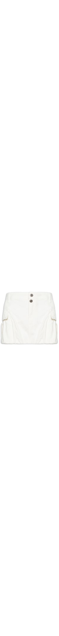 A saia branca é confeccionada em sarja cotelê sem elasticidade. A peça solta ao corpo possui cintura média, cós com passantes aplicados, tag metalizada da marca aplicada na parte posterior, dois bolsos laterais com aba sobreposta e fechamento por botões, pregas laterais, barra com elástico embutido, comprimento mini e fechamento frontal por zíper e botões.