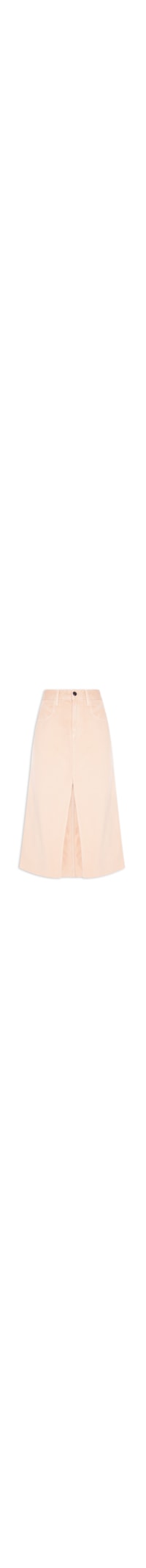 A saia bege é confeccionada por sarja sem elasticidade. A peça solta ao corpo possui cintura média, passantes aplicados no cós, bolsos frontais embutidos, recorte frontal, fenda frontal, recorte posterior, bolsos posteriores, barra com acabamento a corte a fio, fechamento por botão e zíper frontal e comprimento midi.