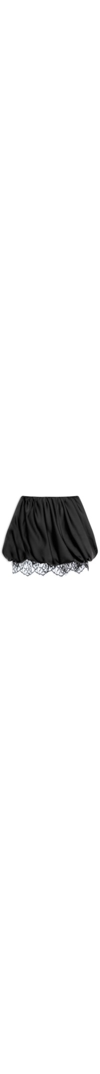 A saia preta é confeccionada tecido leve com acabamento acetinado sem elasticidade. A peça de modelo balloon possui cintura média, cós elástico, efeito drapeado, barra assimétrica com aplicação de renda e comprimento curto.
