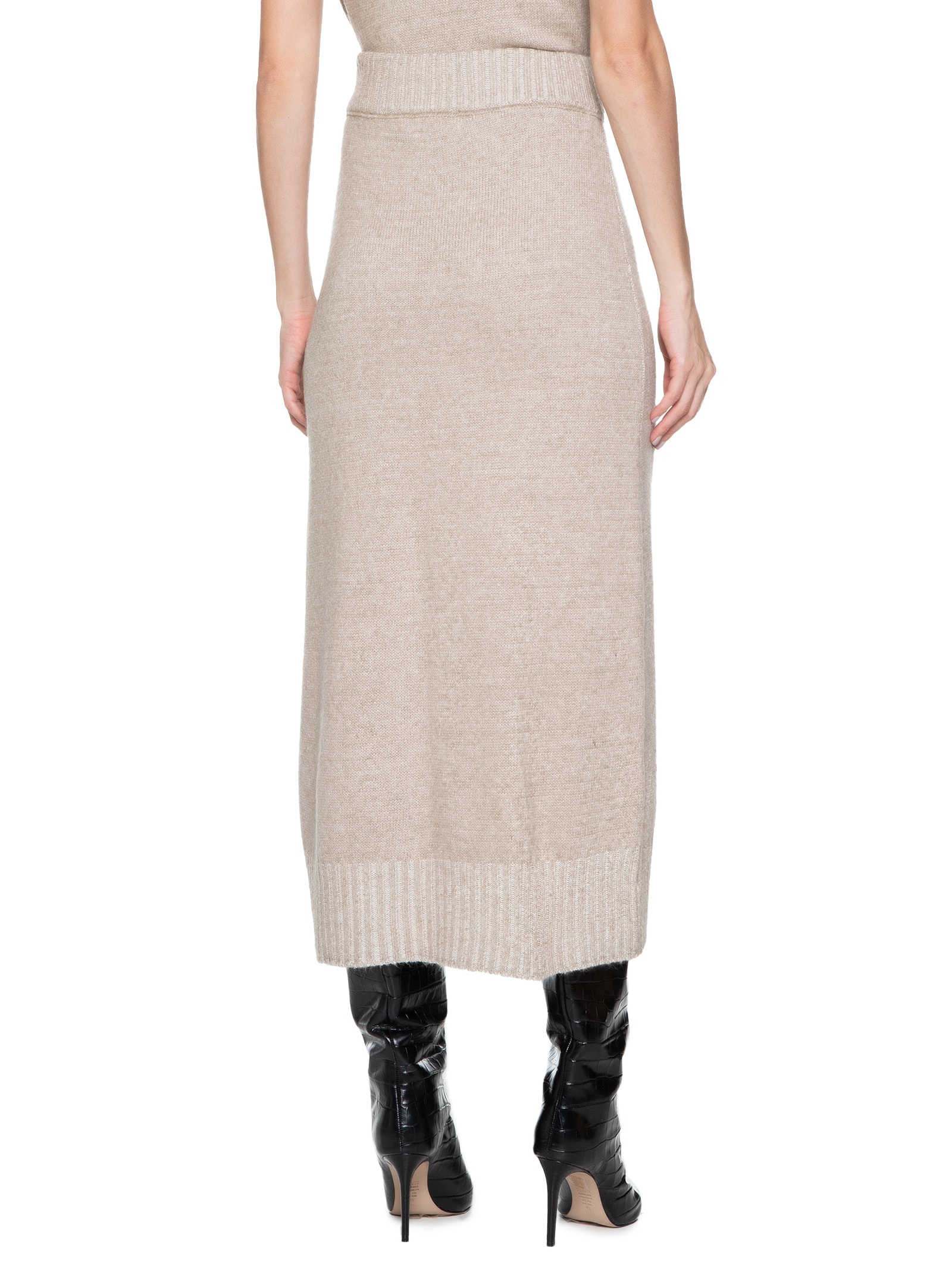 A saia bege é confeccionada em tricot sem elasticidade. A peça solta ao corpo possui cintura alta, cós amplo com elástico embutido, acabamento canelado no cós e na barra, fenda média na parte frontal e comprimento midi.