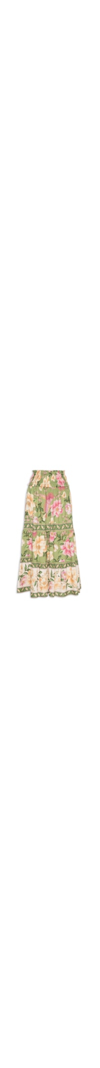 A saia verde é confeccionada em tecido leve sem elasticidade. A peça solta ao corpo possui cintura alta, cós amplo com lastex aplicado e acabamento em babados, recorte no comprimento com efeito franzido, estampa floral em cores contrastantes e comprimento midi.