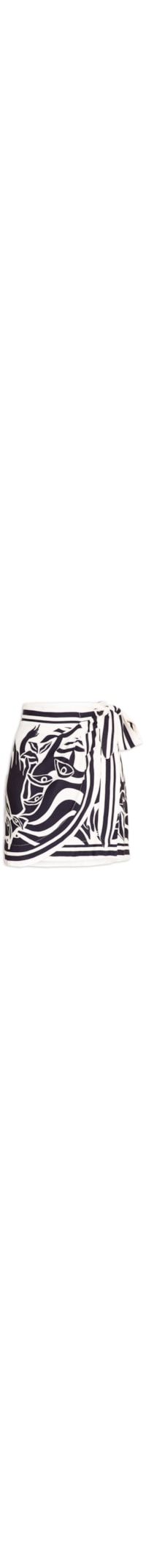 A saia preta é confeccionada em tecido leve sem elasticidade. A peça solta ao corpo possui cintura alta, recorte frontal sobreposto com faixas laterais estendidas para amarração, comprimento curto e mix de estampas em cores contrastantes.