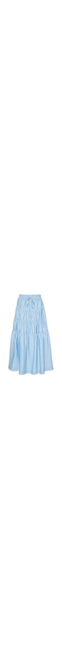 A saia azul é confeccionada em tecido leve com baixa elasticidade. A peça solta ao corpo possui cintura alta, cós com detalhe de babado, elástico e cordão embutido para amarração frontal, recortes com detalhe de franzido e comprimento longo.