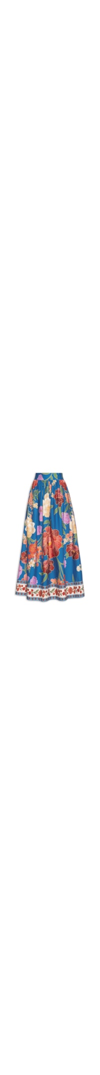 A saia azul é confeccionada em tecido leve sem elasticidade. A peça solta ao corpo possui cintura alta, cós com elástico embutido na parte posterior, estampa floral em cores contrastantes e comprimento midi.