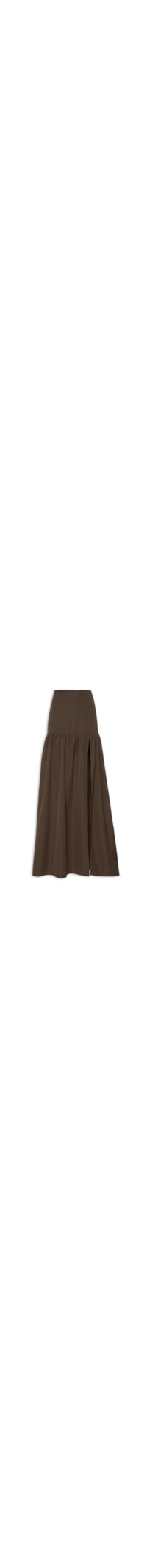 A saia marrom é confeccionada em tecido leve sem elasticidade. A peça solta ao corpo, possui cintura alta, recorte com franzido frontal e posterior, fenda frontal, pences posteriores, comprimento longo, forro e fechamento posterior por zíper invisível.