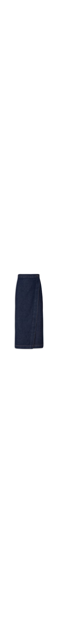 A saia azul é confeccionada em sarja com lavagem jeans e sem elasticidade. A peça solta ao corpo possui cintura alta, cós com tag da marca aplicada na parte posterior, pences posteriores, comprimento midi e fechamento frontal em botão.