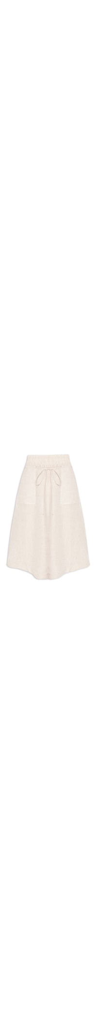 A saia bege é confeccionada em linho sem elasticidade. A peça solta ao corpo, possui cintura alta, cós largo com elástico e cordão embutido, passantes aplicados na cintura, bolsos frontais sobrepostos, tag metalizada da marca aplicada na parte posterior da cintura, barra arredondada, comprimento midi e forro. Acompanha cordão fino para amarração opcional na cintura.