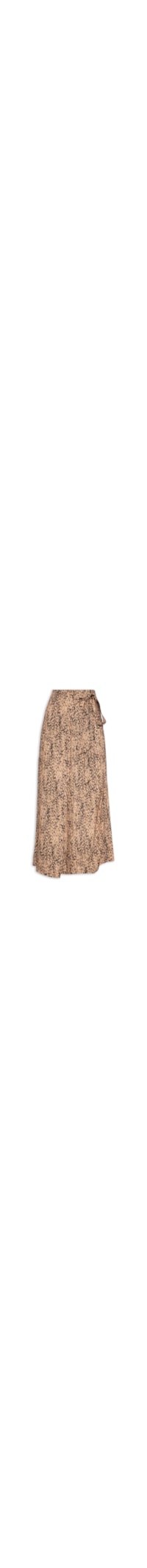 A saia marrom é confeccionada em tecido leve sem elasticidade. A peça solta ao corpo de modelo envelope possui cintura alta, cós com elástico embutido na parte posterior, pences posteriores, tiras alongadas aplicadas nas laterais para amarração, estampa abstrata em tons contrastantes e comprimento midi.