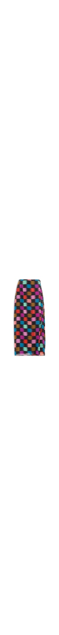 A saia preta é confeccionada em tecido leve sem elasticidade. A peça solta ao corpo possui cintura alta, tecido frontal com efeito transpassado, padronagem xadrez em cores contrastantes, comprimento midi e fechamento lateral por botão e fivela metalizada com tira alongada e ilhoses.