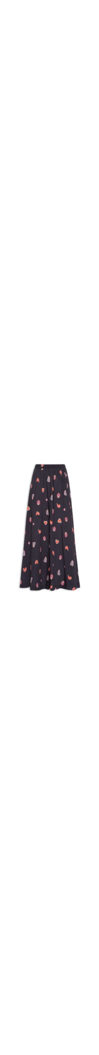 A saia preta é confeccionada em tecido leve sem elasticidade. A peça solta ao corpo possui cintura alta, cós com elástico embutido, bolsos frontais modelo faca, comprimento longo e mix de estampas de corações em cores contrastantes.