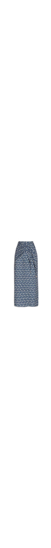 A saia azul é confeccionada em tecido leve com toque de linho sem elasticidade. A peça solta ao corpo, possui cintura alta, fendas laterais, estampa abstrata e cores contrastantes, comprimento longo e fechamento lateral por zíper invisível. Acompanha lenço triangular para uso opcional em mesmo tecido, ponteiras de miçangas com detalhe metálico removível por fecho lagosta e estampa abstrata em cores contrastantes.