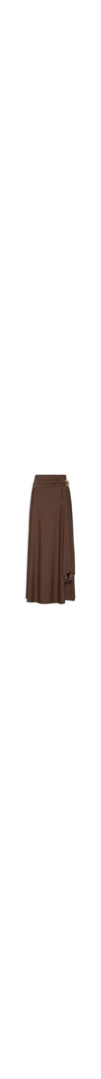 A saia marrom é confeccionada em tecido leve com alta elasticidade. A peça solta ao corpo de modelo evasê possui cintura alta, cós com elástico embutido, faixa alongada sobreposta na parte frontal com ajuste por fivela metálica e comprimento longo.