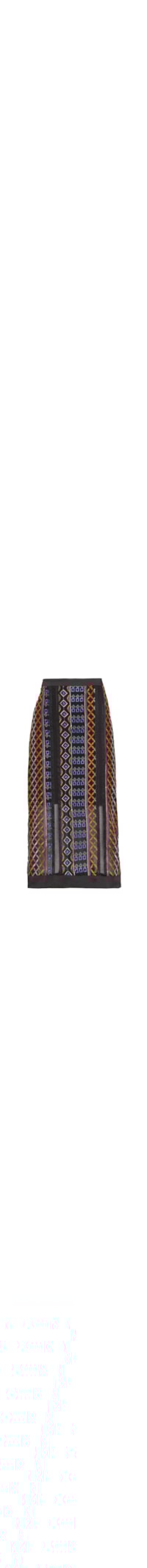 A saia preta é confeccionada em tule. A peça solta ao corpo possui cintura alta, bordados geométricos em cores contrastantes, forro curto, transparência, comprimento midi e fechamento posterior por zíper invisível.