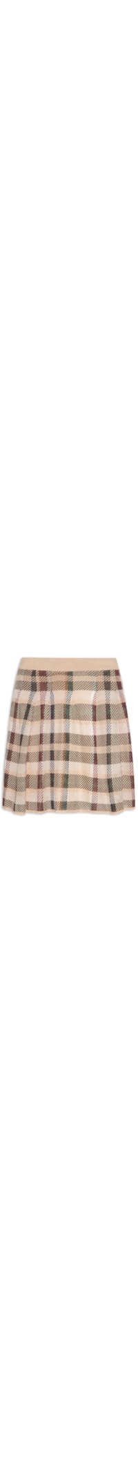 A saia bege é confeccionada em tricot com baixa elasticidade. A peça solta ao corpo possui cintura alta, cós elástico, pregas na parte frontal e posterior, padronagem xadrez em cores contrastantes, forro e comprimento curto.