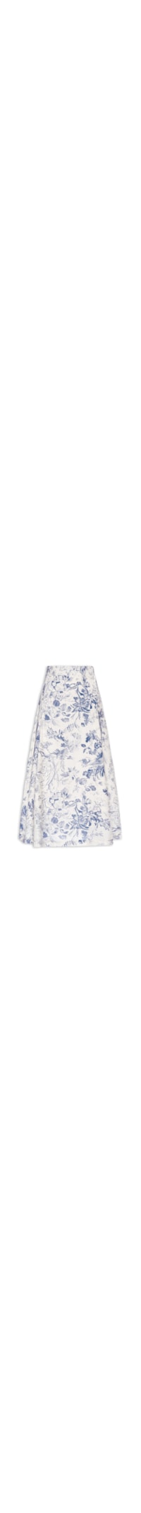 A saia azul é confeccionada em tecido leve com toque de linho sem elasticidade. A peça solta ao corpo possui cintura alta, cós com passante, bolsos posteriores, tag metalizada aplicada na parte posterior, pregas frontais e posteriores, detalhe com tecido frontal sobreposto e aplicações de botões, forro curto, mix de estampas em cor contrastante e comprimento midi.