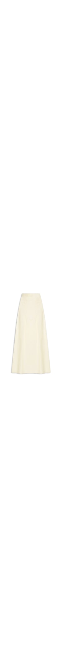 A saia bege é confeccionada em tecido leve com toque de linho e sem elasticidade. A peça solta ao corpo possui cintura alta, cós com martingale aplicado na parte frontal e elástico embutido na parte posterior, bolsos frontais embutidos, pregas frontais e posteriores, fendas laterais, forro, comprimento midi e fechamento lateral por zíper invisível.