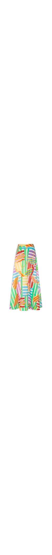A saia rosa é confeccionada em tecido leve. A peça possui cintura alta, recorte com fenda frontal, estampa abstrata em cores contrastantes, comprimento longo, shape solto e fechamento posterior por zíper invisível.