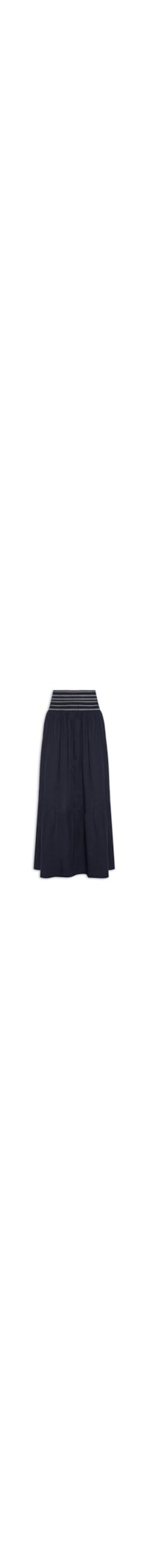 A saia azul é confeccionada em tecido leve sem elasticidade. A peça solta ao corpo possui cintura alta, cós largo com lastex aplicado e detalhes bordados em cores contrastantes, forro, detalhe plissado na parte inferior, comprimento midi, e tag da marca aplicada em metal.