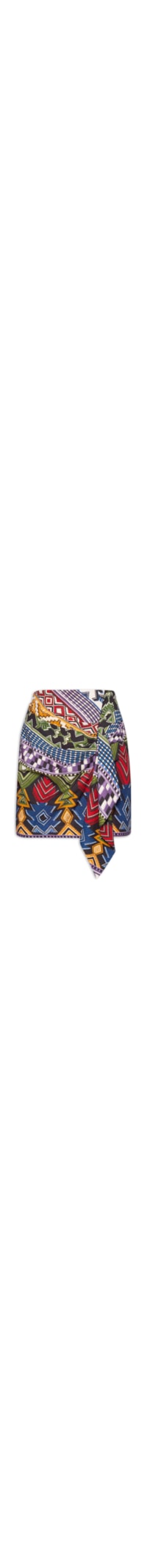 A saia vermelha é confeccionada em tecido leve com toque de linho sem elasticidade. A peça solta ao corpo possui cintura alta, recorte frontal sobreposto com efeito de babados, padronagem geométrica em cores contrastantes, comprimento curto e fechamento posterior por zíper.