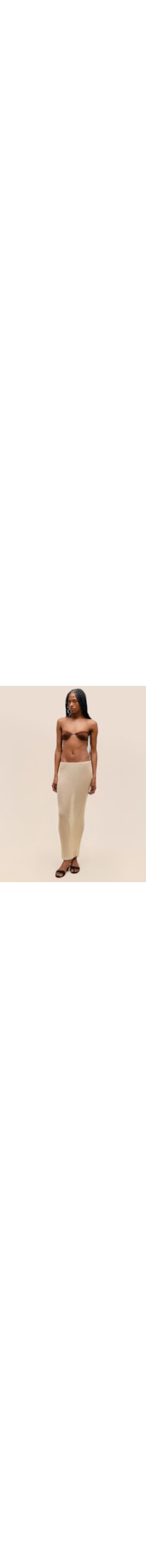 A saia bege é confeccionada em tricot com média elasticidade. A peça justa ao corpo possui cós em malha canelada, caimento reto, comprimento midi e barra com acabamento canelado.