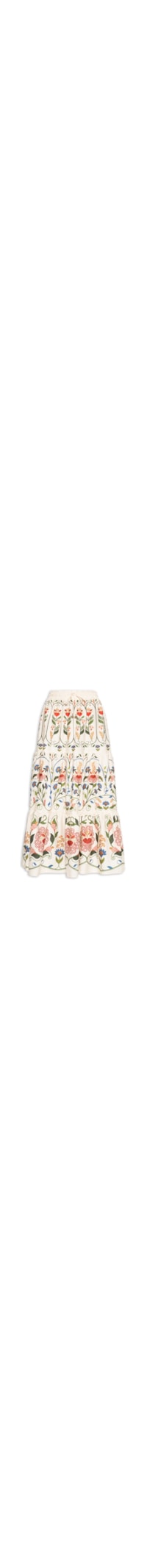 A saia branca é confeccionada em tecido leve sem elasticidade. A peça solta ao corpo possui cintura alta, cós com elástico e cordão embutido para ajuste, recortes com franzidos, mix de estampas em cores contrastantes e comprimento longo.