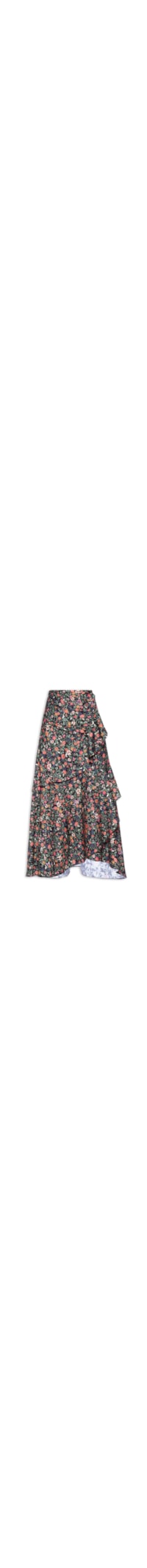 A saia preta é confeccionada em tecido leve sem elasticidade. A peça solta ao corpo possui cintura alta, pala sobreposta com detalhe de babado em camadas e franzidos na parte frontal e posterior, estampa floral em cores contrastantes, comprimento midi, recorte posterior em lastex, barra mullet* e acabamento pespontado.
