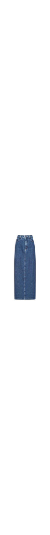a saia Azul é Confeccionada Em sarja Com Lavagem Jeans Sem Elasticidade. A Peça Solta Ao Corpo Possui Cintura Alta, Cós Com Passantes Aplicados, Five Pockets*, Tag Da Marca Aplicada Na Parte Posterior, Fenda Posterior, Comprimento Longo E Fechamento Frontal Por Botão E Zíper.
