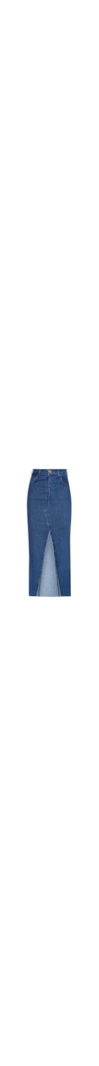 A saia azul marinho é confeccionada em sarja com lavagem em jeans com alta elasticidade. A peça justa na altura da cintura e do quadril e solta no comprimento possui cintura alta, cós com passantes e tag da marca bordada na parte posterior, recortes posteriores, recorte frontal com fenda, five pockets*, barra com acabamento em corte á fio e desfiada, comprimento midi e fechamento frontal por botão e zíper.