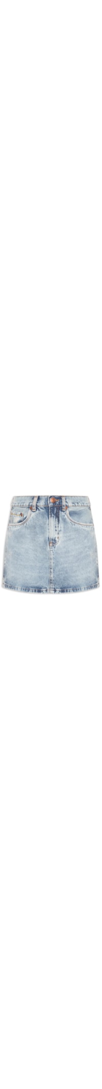 A saia azul é confeccionada em sarja com lavagem jeans sem elasticidade. A peça solta ao corpo possui cintura alta, cós com passantes aplicados, five pockets*, recortes na parte posterior, tag da marca aplicada no cós posterior, detalhes com efeito puído, efeito estonado, comprimento curto e fechamento frontal por botão e zíper.