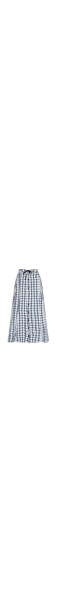 A saia azul é confeccionada em tecido leve sem elasticidade. A peça solta ao corpo possui cintura alta, cós com cordão embutido para ajuste frontal, bolsos frontais modelo faca, padronagem xadrez em cores contrastantes, comprimento midi e fechamento frontal por botões.