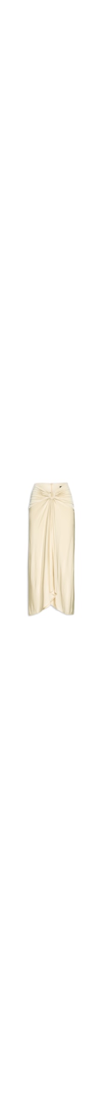 A saia bege é confeccionada em tecido leve com média elasticidade. A peça justa ao corpo possui cintura alta, adereço embutido no meio da cintura formando uma leve abertura, franzido nas laterais e parte posterior, barra com assimetria na parte frontal, fechamento por zíper invisível e colchete, forro e comprimento midi.