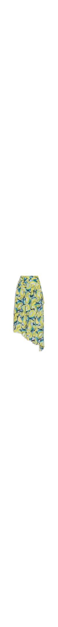A saia azul é confeccionada por tecido leve sem elasticidade. A peça solta ao corpo possui cintura alta, recorte na cintura com detalhes franzidos, mix se estampas em cores contrastantes, forro, fechamento por zíper lateral e comprimento midi.