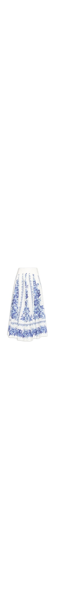 A saia azul é confeccionado em laise sem elasticidade. A peça solta ao corpo possui cós amplo com recorte posterior em lastéx, recortes vazados ao longo da peça, forro, estampa floral em cor contrastante e comprimento midi.