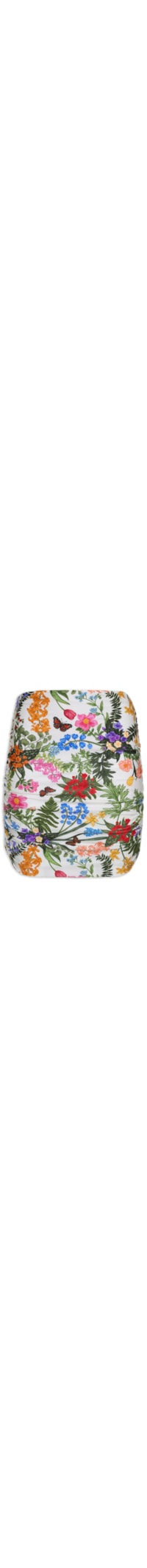 A saia branca é confeccionada em malha microfibra. A peça possui cintura alta, mix de estampas em cores contrastantes, franzidos nas partes laterais, drapeado nas partes posterior e frontal e comprimento curto.