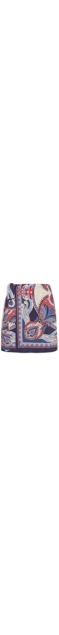 A saia azul é confeccionada em tecido leve sem elasticidade. A peça solta ao corpo possui cintura alta, recorte frontal sobreposto com faixas laterais estendidas para amarração, mix de estampa em cores contrastantes e comprimento curto.