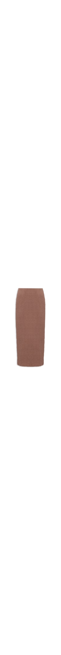 A saia marrom é confeccionada em malha texturizada com alta elasticidade. A peça possui cintura alta, cós reto, caimento ajustado ao corpo, modelagem reta, fenda posterior, comprimento midi e superfície texturizada.