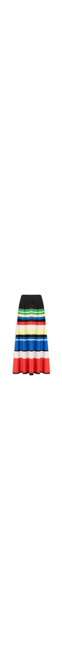 A saia azul é confeccionada em tecido leve sem elasticidade. A peça solta ao corpo possui cintura alta, recorte posterior, padronagem listrada em cores contrastantes, comprimento midi e fechamento posterior por zíper invisível.