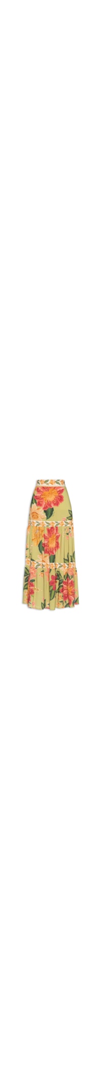 A saia verde é confeccionada em tecido leve sem elasticidade. A peça solta ao corpo de cintura alta, possui recortes frontais e popsteriores, cós comlastex aplicado na parte posterior, estampa floral em cores contrastantes, comprimento longo, sem forro, sem fechamento.