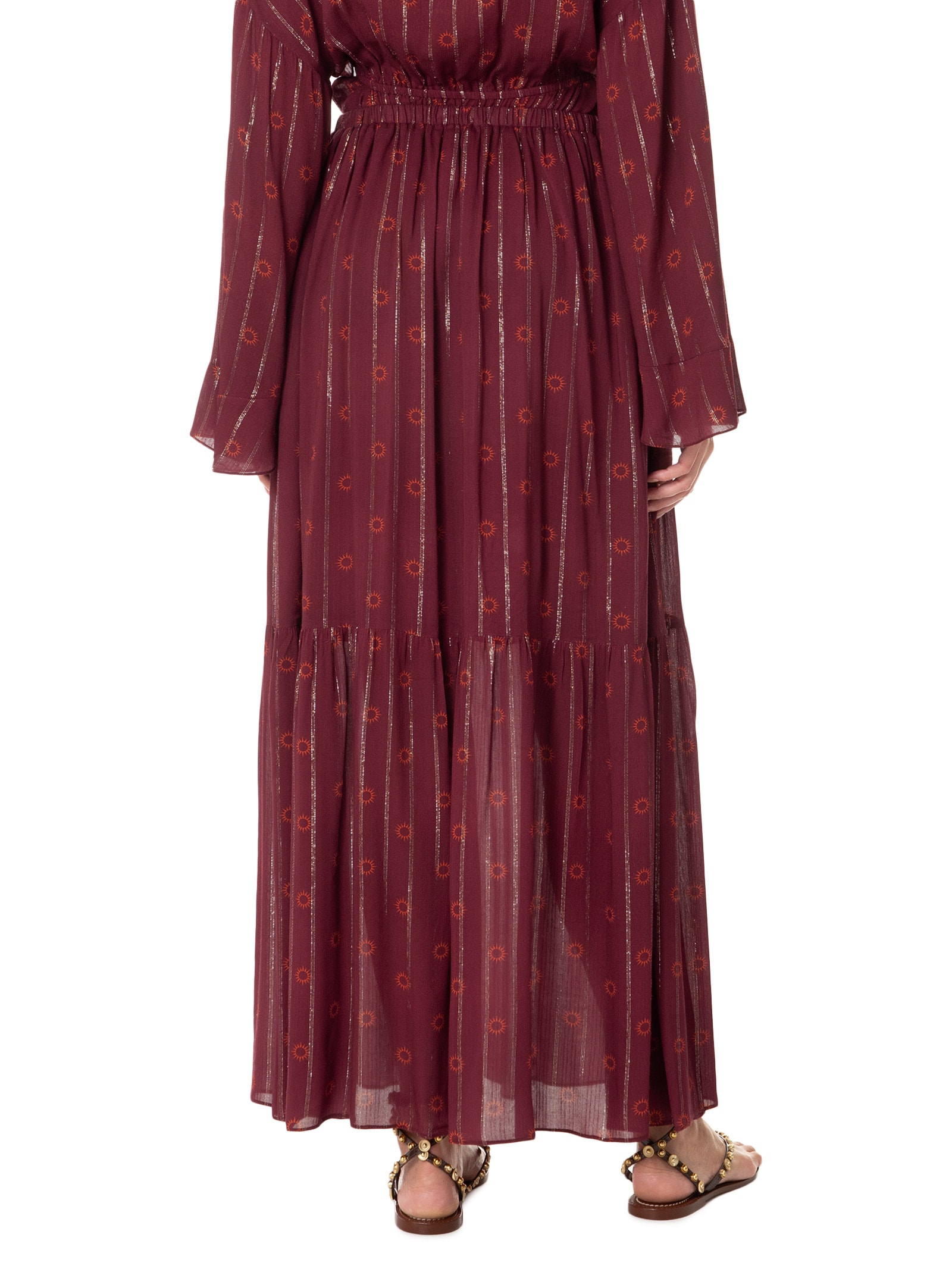 A saia vinho é confeccionada em tecido leve sem elasticidade. A peça solta ao corpo possui cintura alta, cós com elástico embutido, padronagem listrada em fios de lurex nas cores dourado e prateado, estampa figurativa de sol na cor laranja, meio forro, reocrte com franzidos e comprimento longo.