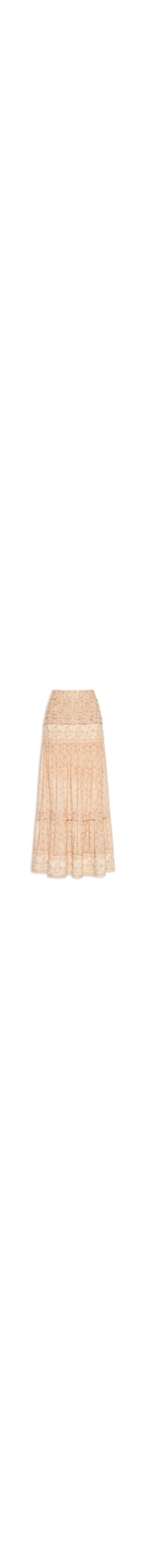 A saia bege é confeccionada tecido leve com fios de lurex e sem elasticidade. A peça solta ao corpo possui cós amplo com tecido sobreposto e efeito de babados, cintura alta, forro, estampa floral em cores contrastantes e comprimento longo.