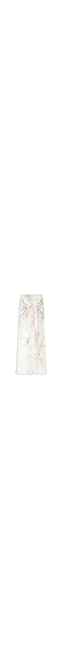A saia off white é confeccionada em tecido leve sem elasticidade. A peça solta ao corpo possui cintura alta, cós com tiras alongadas com detalhes aplicados nas ponteiras para amarração, mix de estampas em cores contrastantes, leve transparência e comprimento longo.