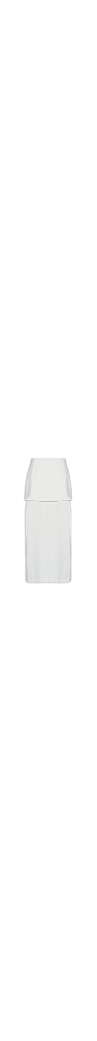 A saia branca é confeccionada em tecido leve sem elasticidade. A peça solta ao corpo, possui cintura alta, recorte sobreposto na parte superior, fendas laterais, comprimento longo, forro curto e fechamento posterior por zíper invisível.