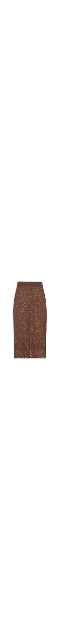 A saia marrom é confeccionada em em tule com superfície texturizada com pouca elasticidade. A peça justa ao corpo possui cintura alta, cós com elástico, forro em tule, detalhe de trama aberta trançada, transparência e comprimento midi.