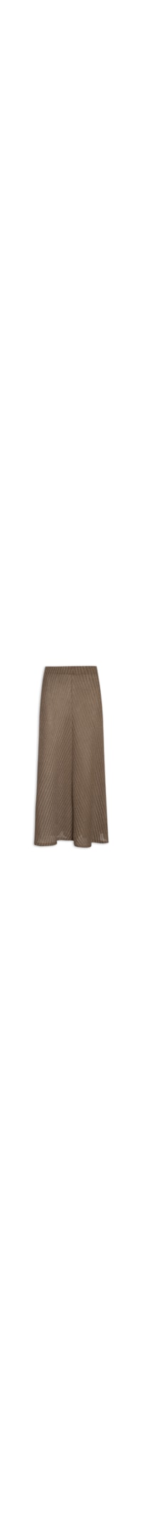 A saia marrom é confeccionada em tricot canelado com fios de lurex e alta elasticidade. A peça solta ao corpo possui cintura alta, cós com elástico embutido, leve transparência e comprimento longo.