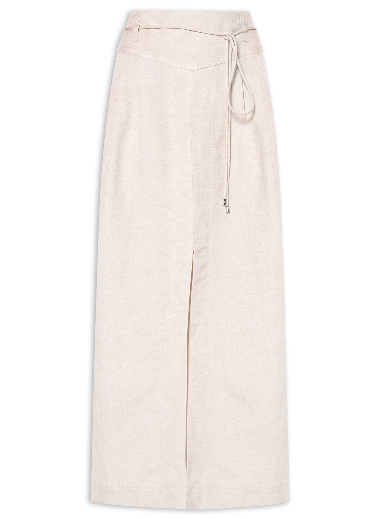 A saia bege é confeccionada em linho misto sem elasticidade. A peça solta ao corpo possui cintura alta, cós amplo com passantes, tag da marca aplicada em metal na parte posterior, pregas frontais na altura do cós, bolsos frontais modelo faca, recorte frontal com fenda, comprimento midi, forro e fechamento lateral por zíper invisível. Acompanha cordão para amarração.