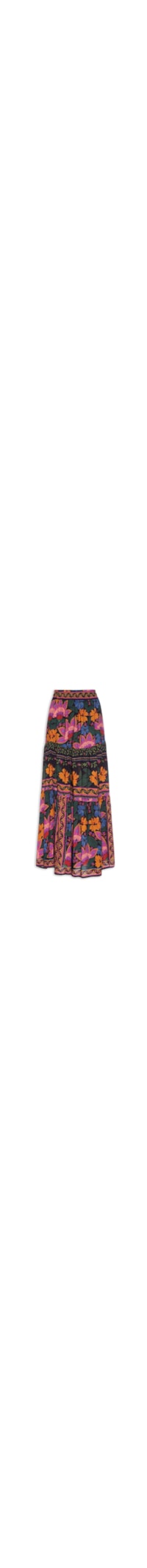 A saia preta é confeccionada tecido leve sem elasticidade. A peça solta ao corpo possui cós elástico, recorte três marias, estampa floral em tons contrastantes e comprimento midi.